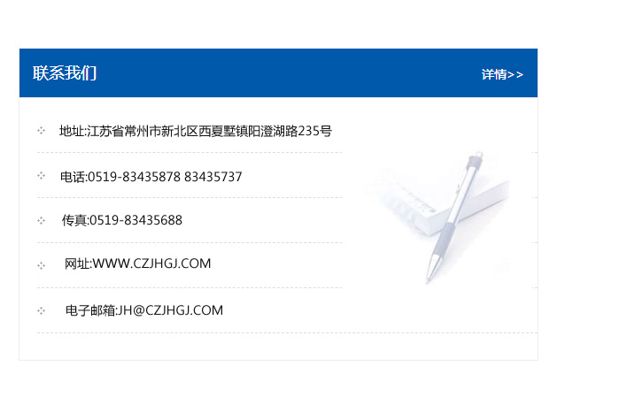 地址:常州市新北區友邦商務大廈1幢16、17層  電話:0519-85101652  傳真:0519-85112595  郵編:213022  網址:www_cz-jiayue_cn.gxsltz.com  郵箱:xiajifengaa@163.com